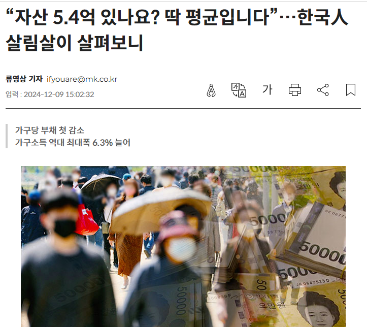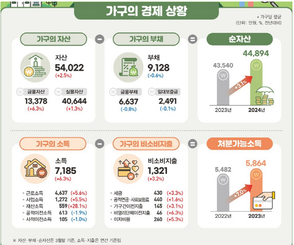 한국은행·금융감독원·통계청의 ‘2024년 가계금융복지 조사결과’에 따르면 올해 3월말 기준 가구 평균자산은 5억 4022만원이었습니다.. 이는 1년 전보다 2.5% 늘어난 수준이라고 합니다.