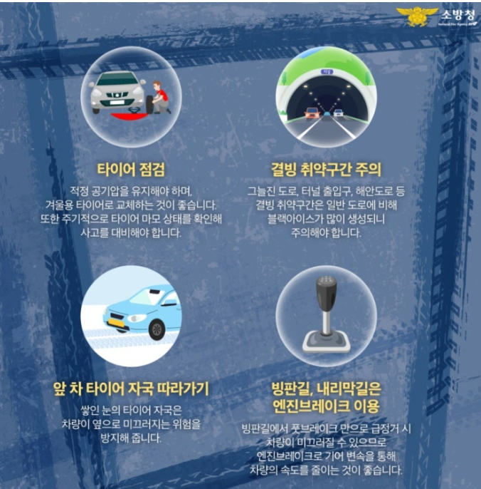 블랙아이스 위험 구간에서는 평소보다 속도를 줄이고, 갑작스러운 조작을 피하는 것이 중요합니다. - 타이어 관리