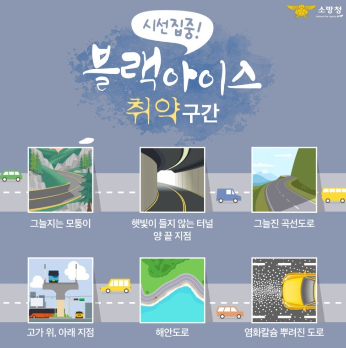 - 산간 지역 도로: 고도가 높고 온도가 낮아 블랙아이스가 잘 생깁니다.