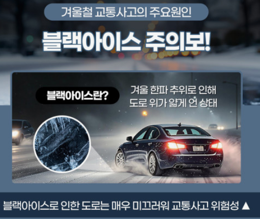 겨울철 도로 위에서 발생하는 블랙아이스(Black Ice)는 도로 표면에 얇게 형성된 투명한 얼음층을 말합니다.