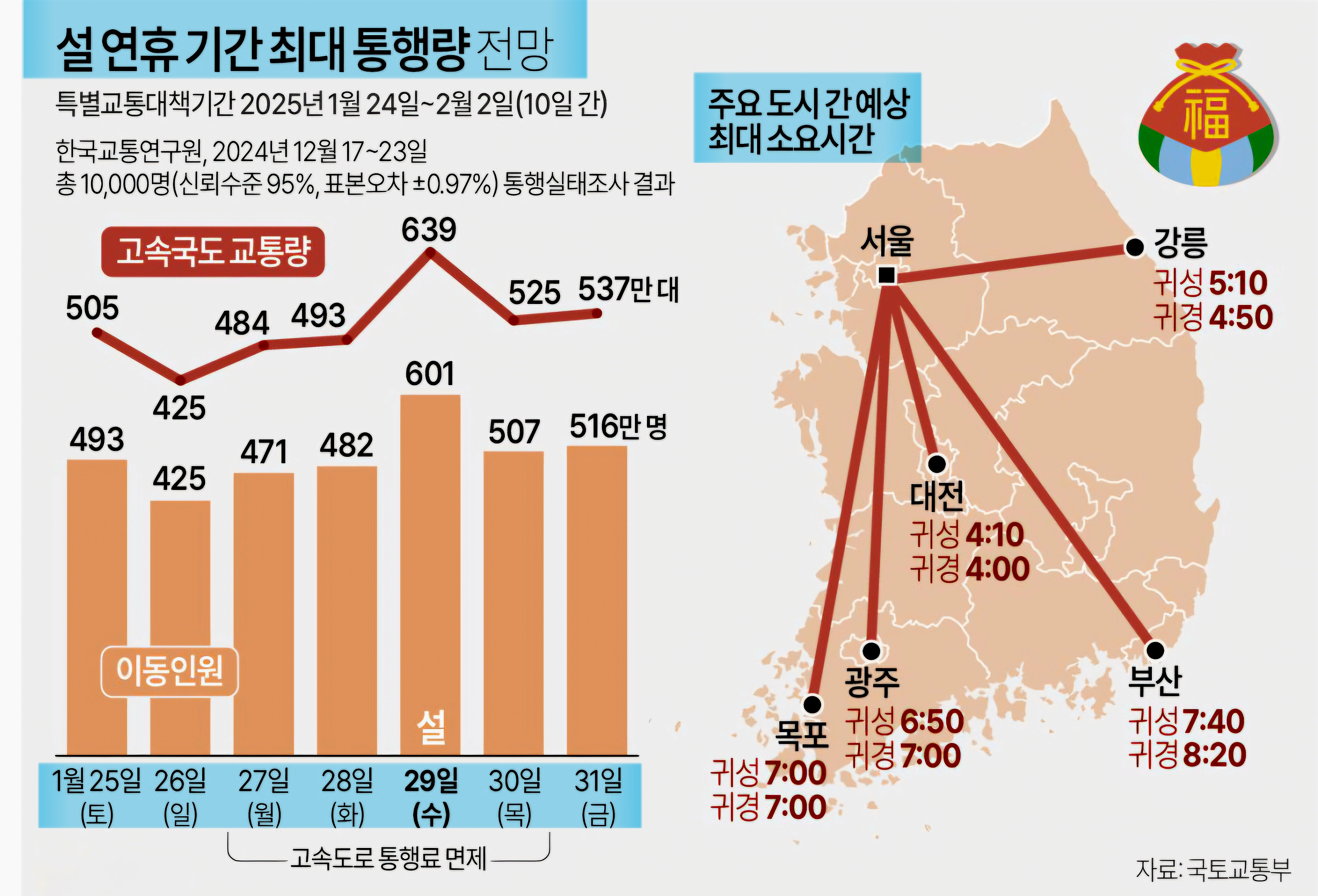 올해의 경우 국토부는 설 연휴 기간 총 3282만 명이 귀성·귀경길에 나설 것으로 예상하고 있습니다. 설 당일인 오는 29일 601만 명에 달하는 최대 인원이 이동할 것으로 전망되며, 이동 시 교통수단은 대부분 승용차(85.7%)를 이용할 것으로 내다봤습니다.