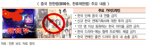 한한령은 한국 콘텐츠를 중국내에서 금지한 법입니다. 특히 중국 정부는 자국 내 중국인에게 대한민국에서 제작한 콘텐츠 또는 한국 연예인이 출연하는 광고부터 한국 기업과 브랜드 등 한국을 담고 있는 모든 요소의 TV 광고까지 송출을 금지하며 ‘한한령(限韓令)’ 실시한 것입니다.