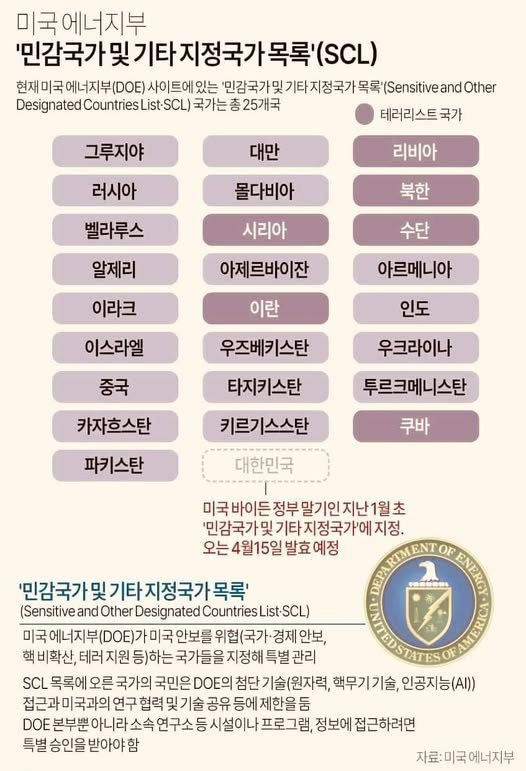 엄밀히 따지자면 한국은 ‘민감 국가’가 아닌 ‘기타 지정 국가’이기 때문인데요. 에너지부는 “민감 국가에 포함됐다고 해서 미국인이나 DOE 직원이 해당 국가 방문해 사업하는 것이 금지되는 게 아니다”라며 “마찬가지로 해당 국가 국민이 DOE를 방문하는 것도 금지되지 않는다”고 언급하기도 했습니다.